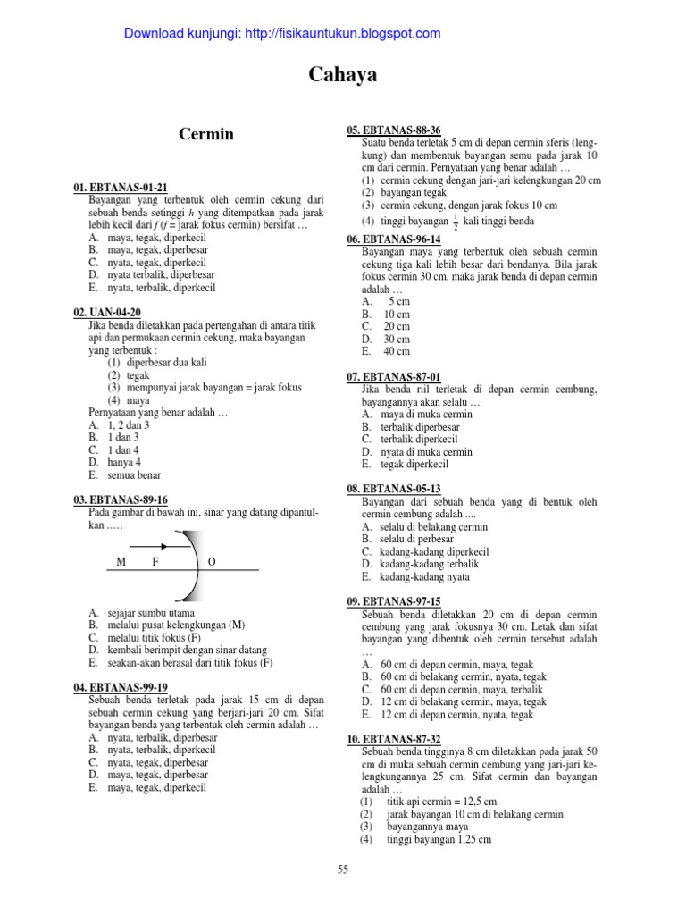 Bank Soal UN Fisika SMA Kumpulan Soal Ujian Nasional Fisika SMA 20082012 2014 dan 2015 Berdasarkan Topik Materi. Pilihlah jawaban yang paling tepat. 15 Soal Alat Optik Pilihan Ganda dan Jawaban Pembahasan Oleh Anas Ilham Diposting pada Maret 3 2020 Agustus 26 2020 Contoh Soal Alat Optik dan Kunci Jawaban beserta Pembahasan Alat-alat optik merupakan alat-alat yang menggunakan lensa danatau cermin untuk memanfaatkan sifat-sifat cahaya yaitu dapat dipantulkan dan dapat dibiaskan cahaya tersebut.