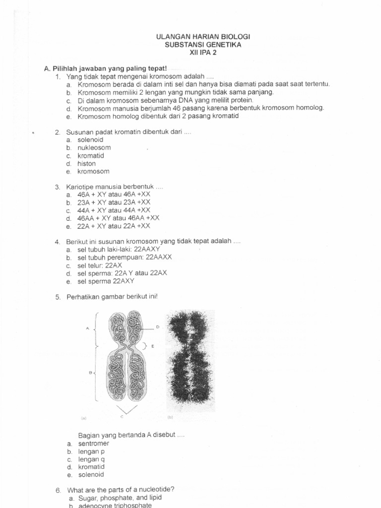 Kromosom pada manusia mulai terbentuk pertama kali pada tahap pembelahan sel. Download Soal UH Biologi SMA Kelas 12 Bab Substansi Genetik Semester 1 dibawah ini yang berdasarkan kurikulum KTSP tahun 2006. Kali ini admin akan memposting beberapa contoh soal dan jawaban tentang substansi genetika moga bermanfaat ya.